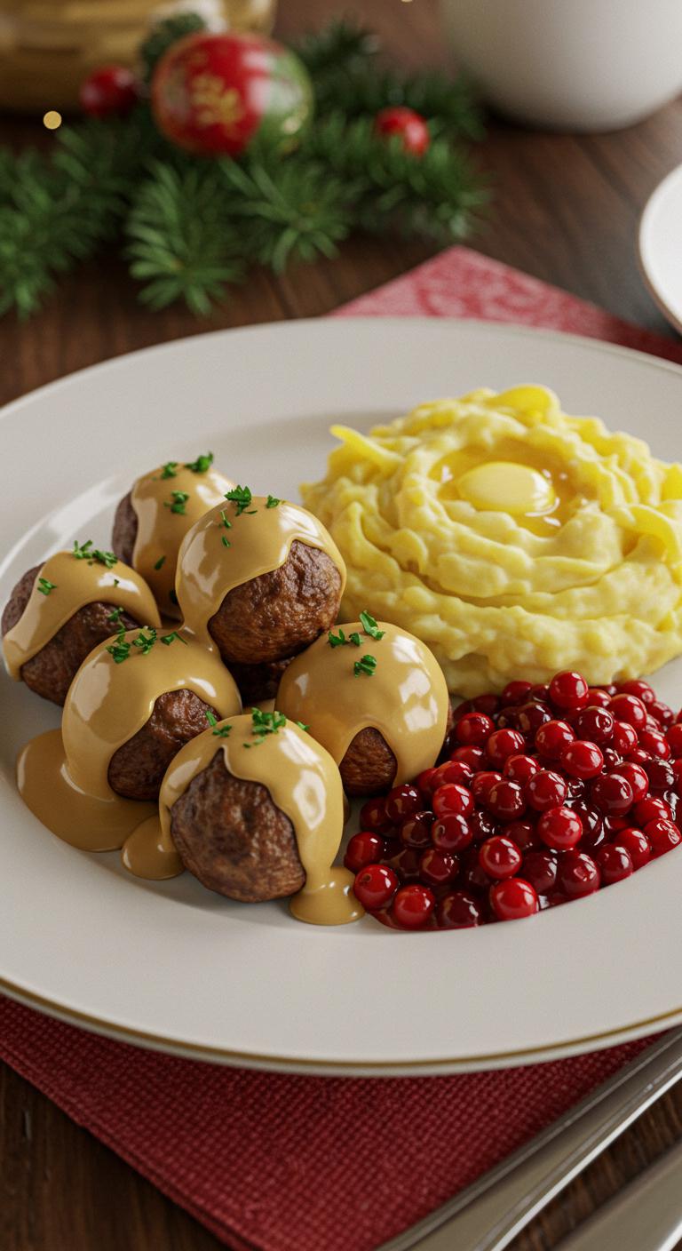 A warm, comforting plate of tender Swedish meatballs with creamy gravy and bright lingonberry sauce — pure Scandinavian holiday coziness.
