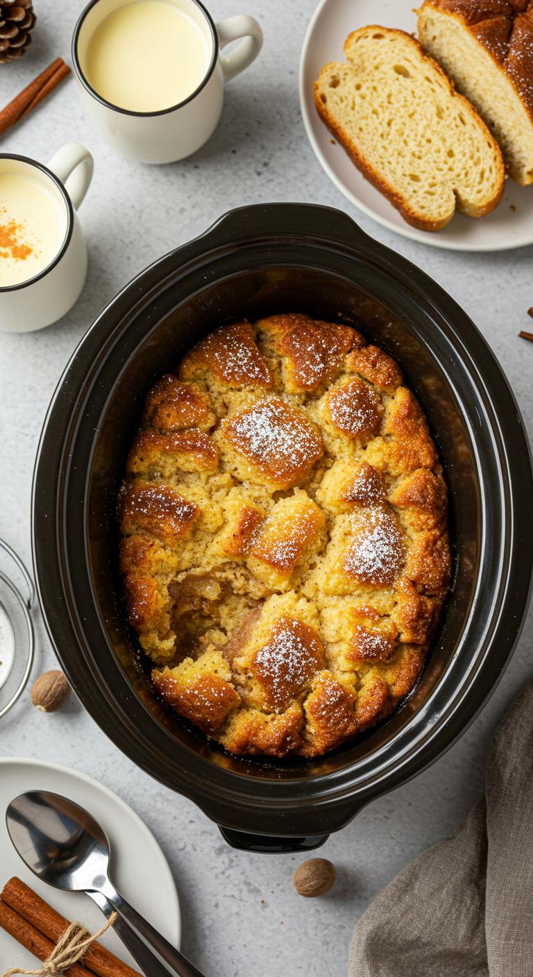 - Cover and cook on LOW for 2 to 3 hours, or until the custard is set and a knife inserted near the center comes out clean — avoid overcooking so it stays creamy.