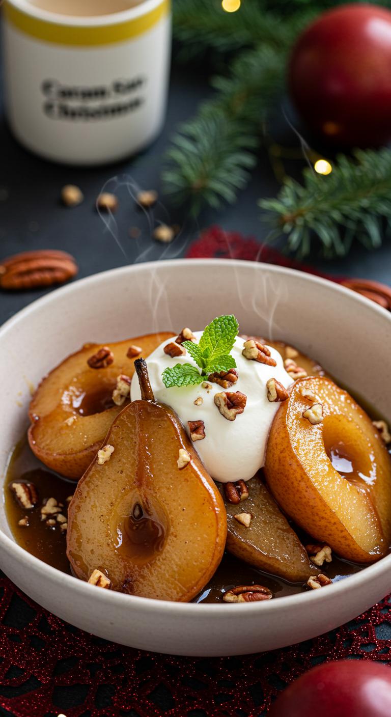 Warm, spiced pears slow-cooked until tender and bathed in caramel, served with silky vanilla cream — holiday comfort in a bowl.