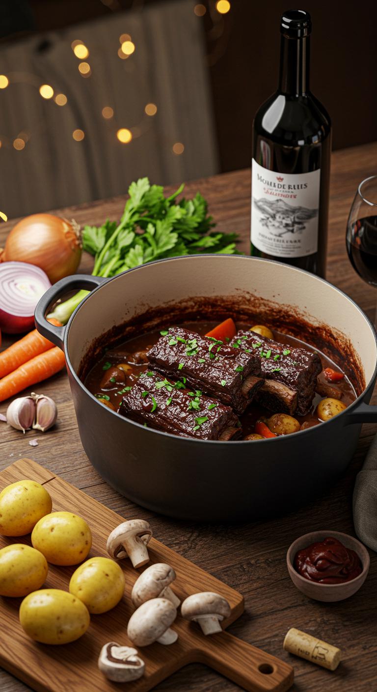 A cozy, rich short rib stew braised in red wine — the ultimate warming Christmas centerpiece.