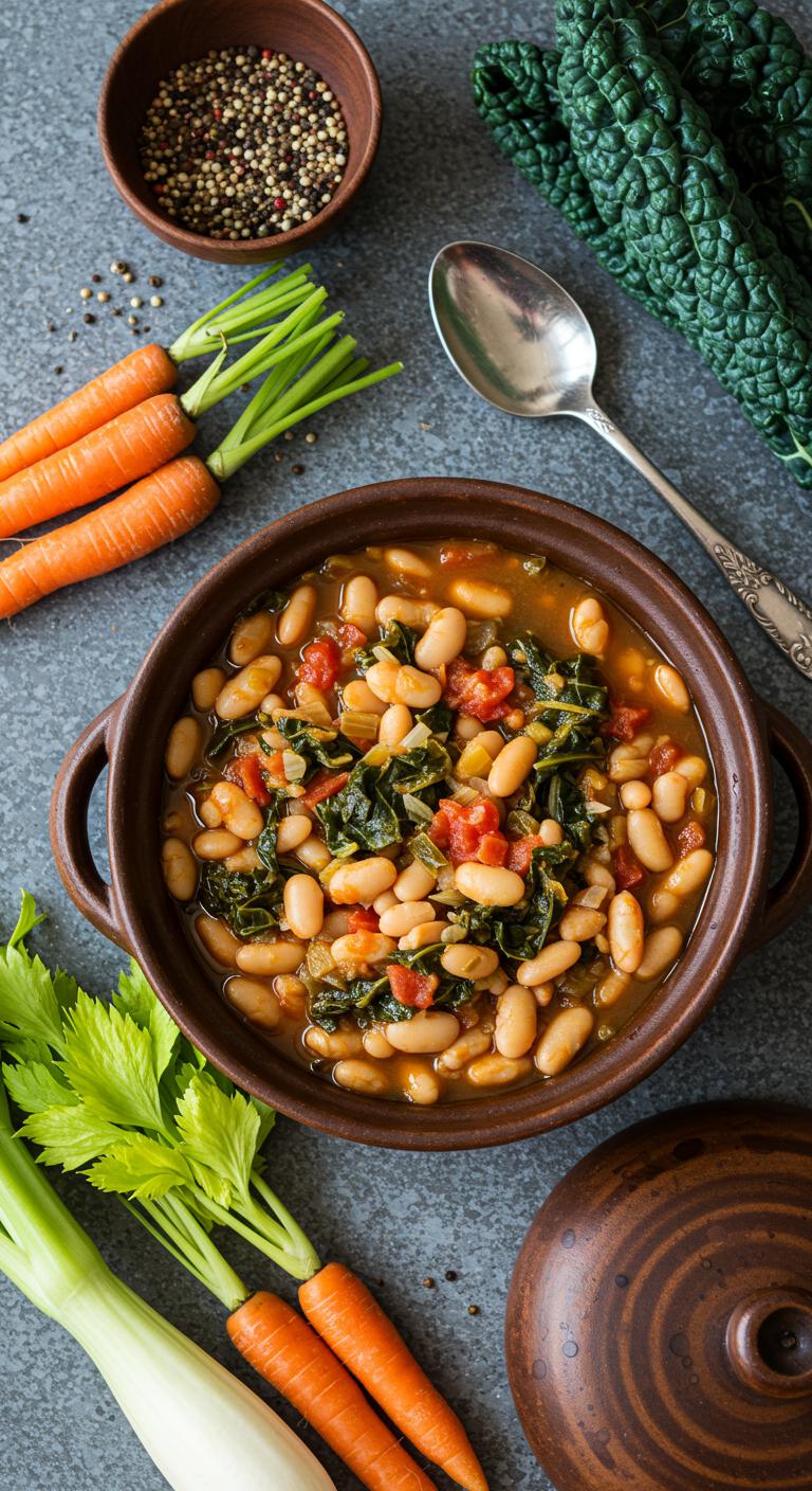 A cozy, bright vegan stew that’s hearty enough for a holiday table — creamy white beans, tender kale, and tangy tomatoes in every spoonful.