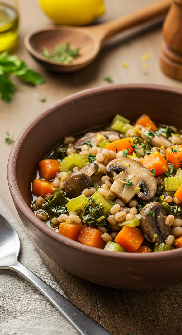 Warm, earthy, and cozy — this mushroom, barley, and thyme stew is a vegetarian hug in a bowl.