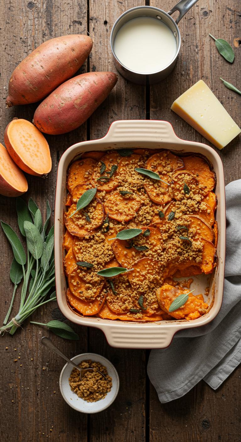 A cozy, cheesy sweet potato gratin topped with crisp sage breadcrumbs — holiday comfort in every golden bite.