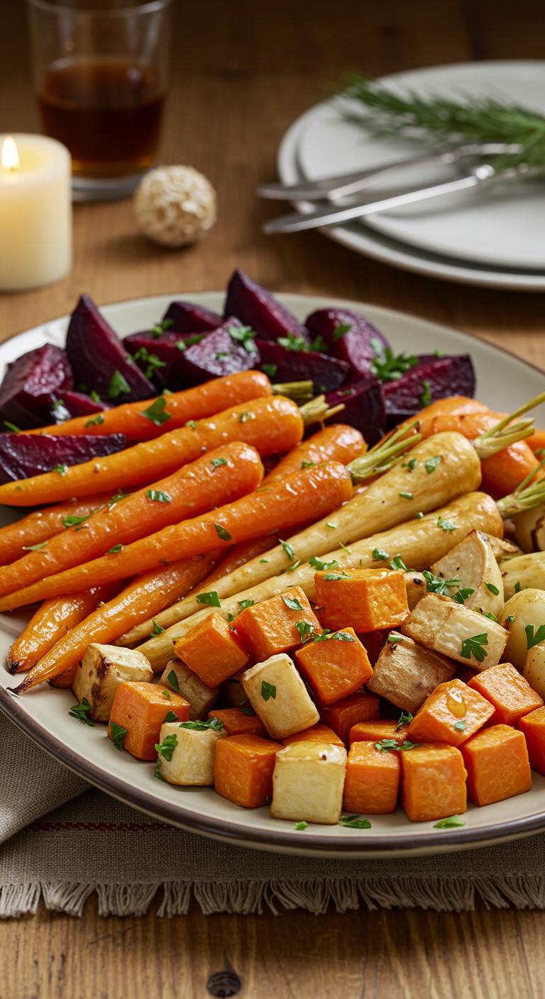A cozy platter of maple-glazed root vegetables — sweet, savory, and perfect for holiday gatherings.