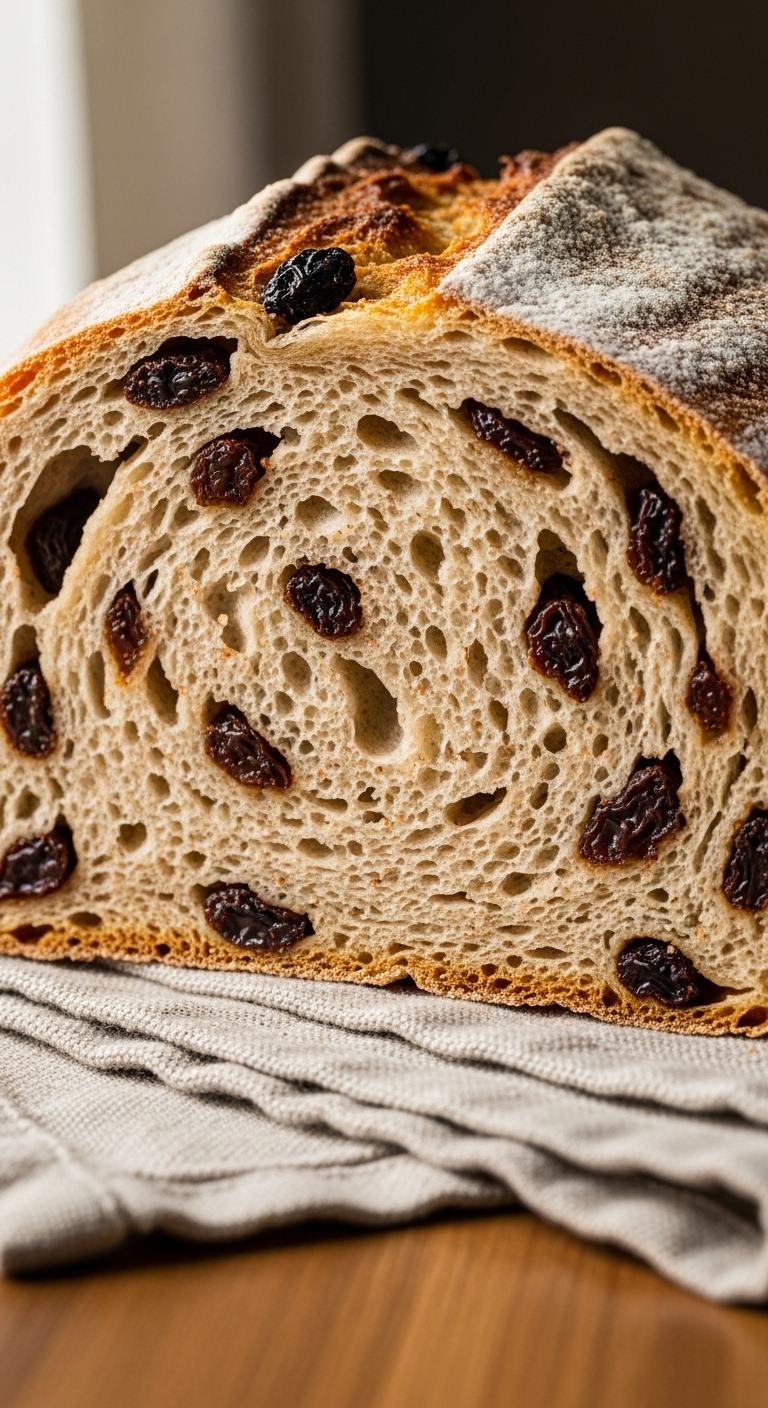 This overnight recipe gives you hands-off fermentation and morning-ready bread. Cold proofing builds flavor and makes the crumb airy. Cinnamon and raisins stay bright without overpowering the sour tang. You’ll love it when you want a bake-ready loaf after a good night’s sleep. Expect a rich aroma and pillowy, slightly chewy slices.