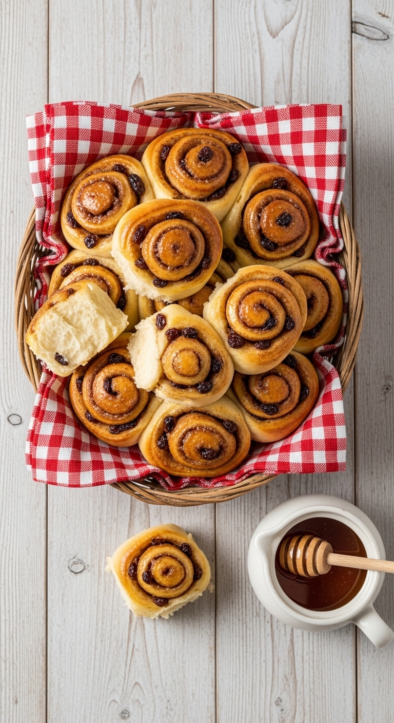 These mini pull-apart rolls are perfect for sharing or single-serve breakfasts. Each roll has a ribbon of cinnamon-sugar and raisins. They bake faster and make a lovely presentation. You’ll love them for brunch spreads and kid-friendly mornings. Expect soft, tender pulls and a sticky cinnamon aroma.