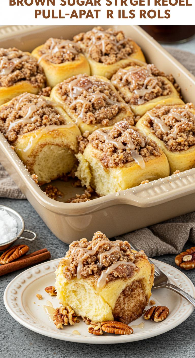 Brown Sugar Streusel Pull-Apart Rolls — gooey, buttery bites loaded with cinnamon and a crunchy brown-sugar streusel.