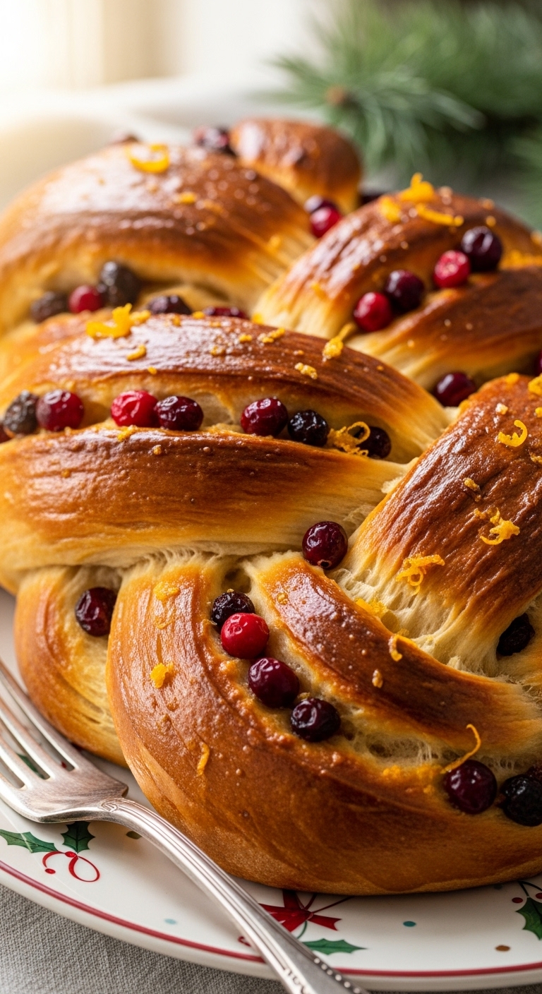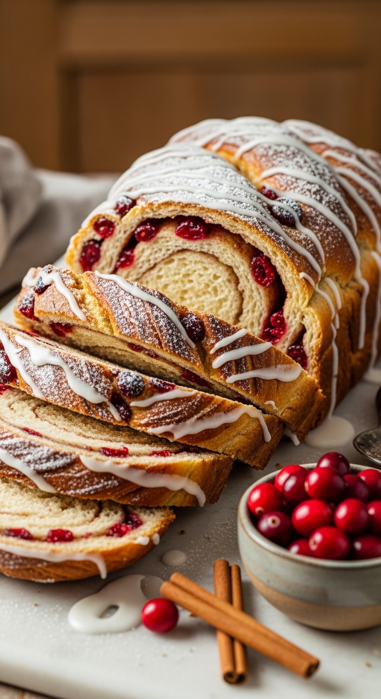 Serve warm with berry jam or clotted cream. Garnish with a sprinkle of powdered sugar and orange zest. Pairs with coffee or spiced tea. Store wrapped in the fridge up to 4 days or freeze slices. Great for a festive breakfast spread.