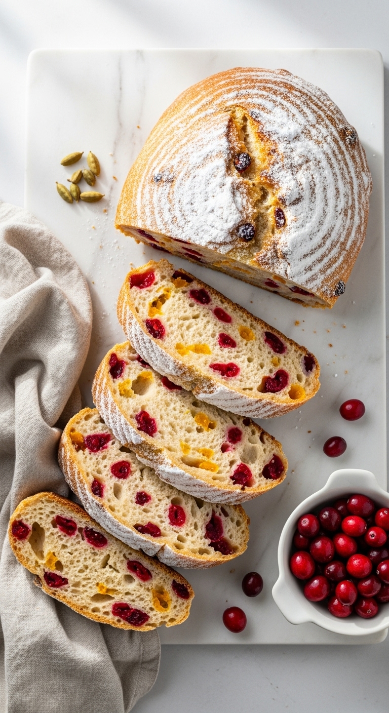 Cranberry Orange Sourdough Bread flavored with cardamom adds warm spice to citrus brightness. The spice complements the tang of sourdough without overpowering it. This loaf offers complex aroma and a soft-to-open crumb. It’s perfect for cozy holiday gatherings or gifting to spice lovers.