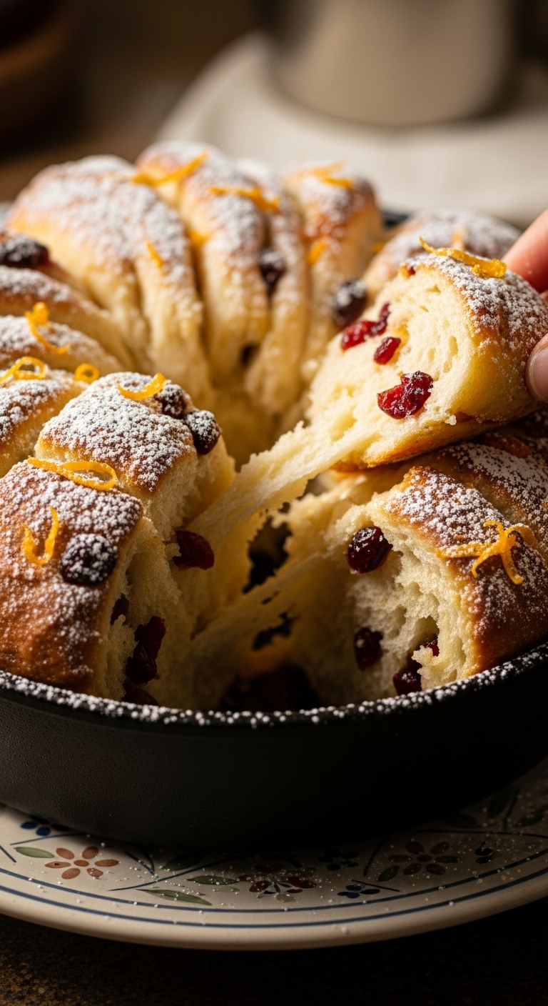Serve warm for best pull-apart effect. Offer lemon butter, cream cheese, or orange glaze for dipping. Pair with holiday coffee or cocoa. Store covered for 2 days; reheat gently. Makes an eye-catching centerpiece.