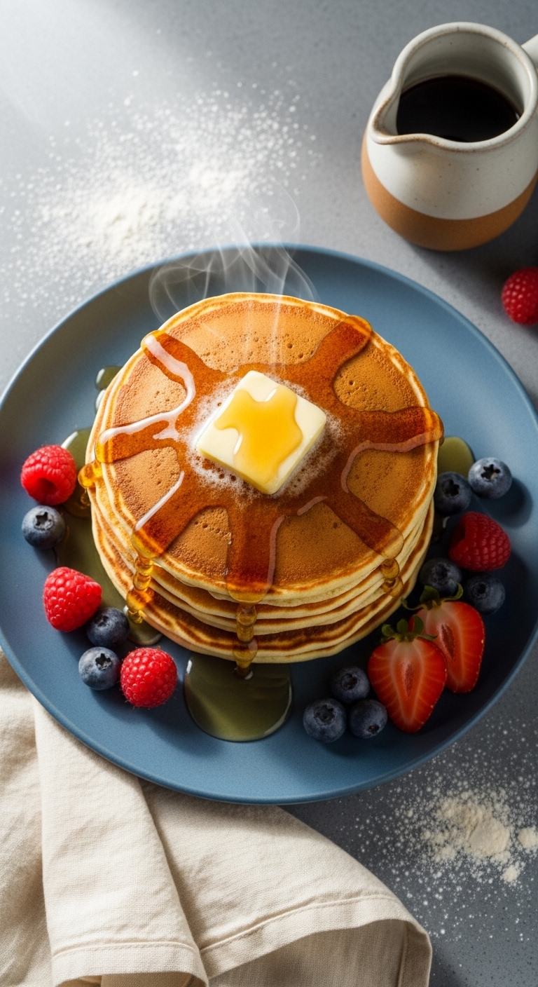 Stack on warm plates with butter and real maple syrup. Top with fresh berries and a dusting of powdered sugar. Serve with crispy bacon or a fruit compote. Refrigerate leftovers up to 3 days; reheat in a skillet. Batter prepped overnight is perfect for busy mornings.