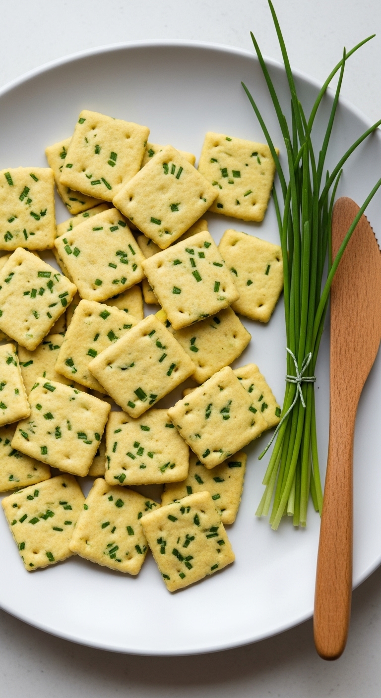 Fresh chives brighten these cheddar crackers with a mild oniony bite. The texture is light and flaky, with herby green flecks throughout.