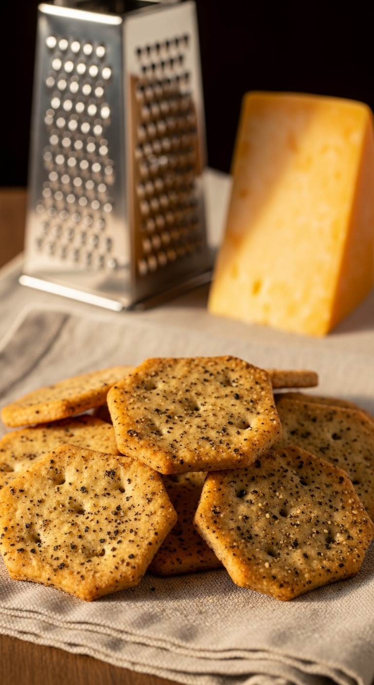 Black pepper adds a sharp, aromatic lift to classic cheddar crackers. The contrast between pepper spice and rich cheddar is lively.