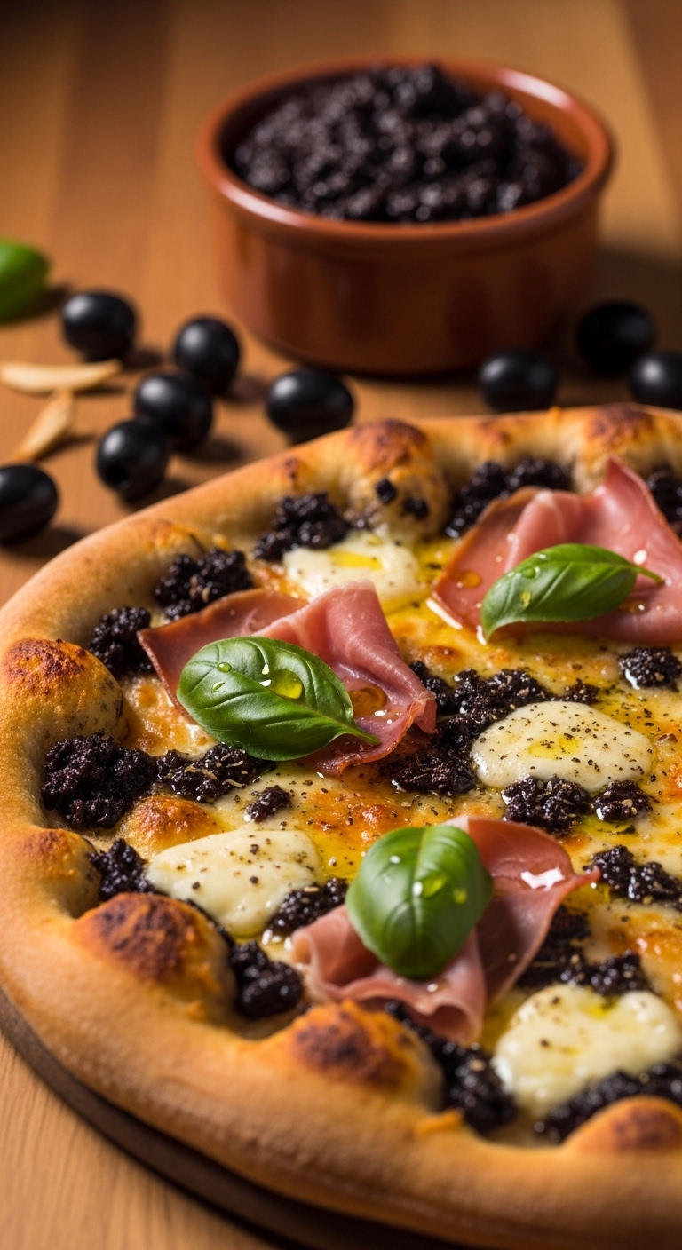 - Add toppings and bake 12–15 minutes until crust is dark golden and tapenade is heated through.