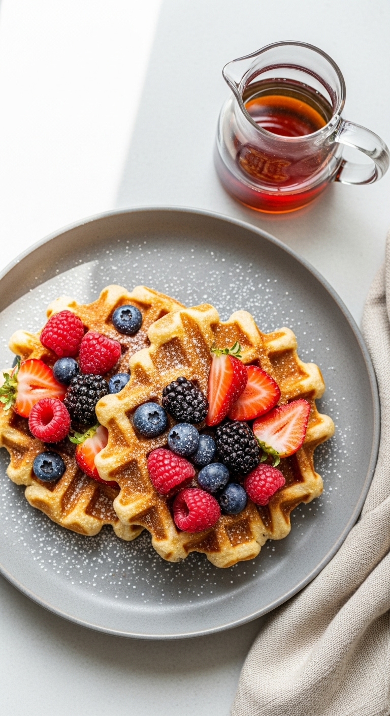 Top with maple syrup, fresh fruit, yogurt, or whipped cream. Pair with coffee or fruit smoothies. Store leftover waffles in the fridge 2–3 days or freeze. Reheat in a toaster or oven for crispness. Batter can be made the night before and used in the morning.