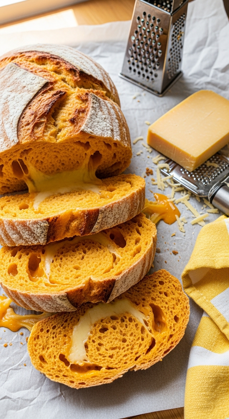 - Fold in shredded cheddar during the last knead so it distributes into layers.