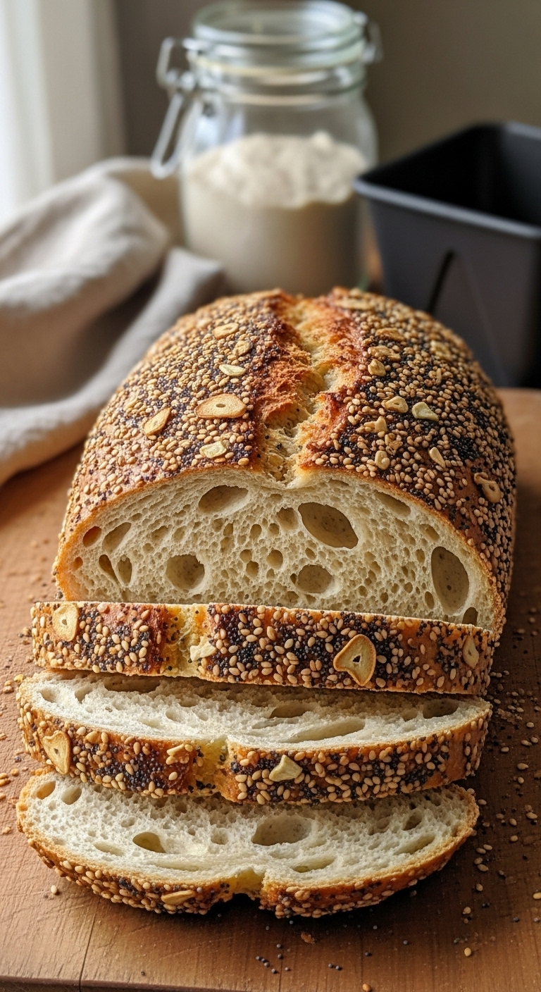 This classic Everything Bagel Sourdough loaf balances a tangy, fermented crumb with a crisp, seasoned crust. The everything bagel seasoning gives toasted sesame, poppy, and garlic flavor. It’s great for sandwiches and toasting for morning breakfasts. You’ll love the chewy interior and crunchy top. The aroma is nutty, garlicky, and slightly sour.