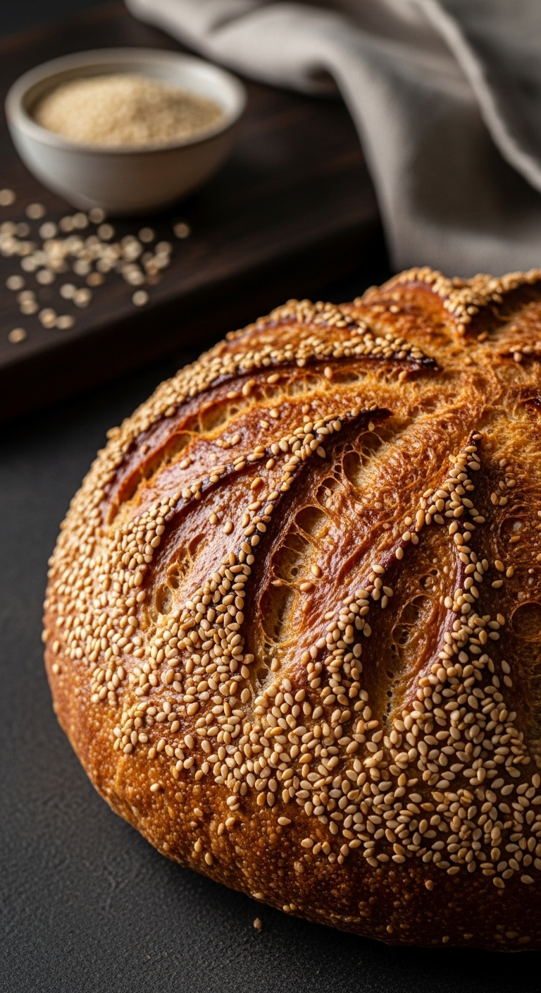 This boule uses a heavy sesame crust for extra crunch. The crumb stays open and tangy from a long ferment. It’s sturdy enough for loaded sandwiches. Fans of nutty sesame and chewy bread will love it. Expect a toasty aroma and chewy texture.