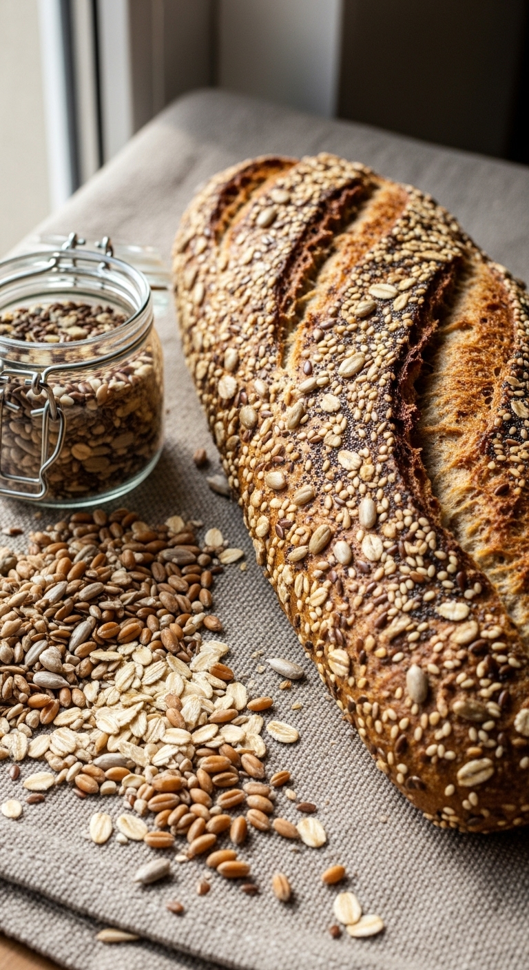 Toast and top with nut butter and sliced bananas. Pair with braised meats or sharp cheeses. Store wrapped at room temp 2–3 days. The seeds add great texture to salads and sandwiches. Make ahead: mix evening before, bake next day.