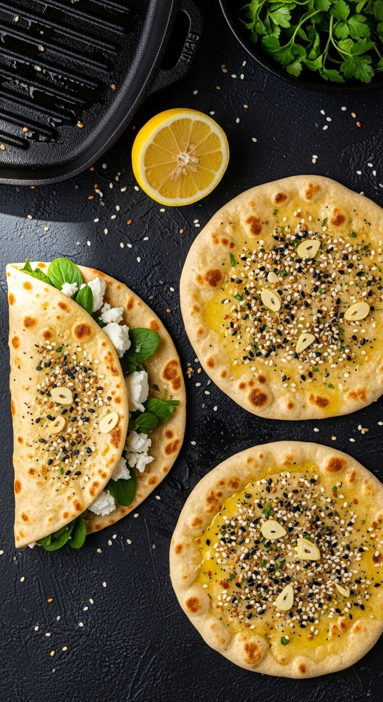 Top with grilled vegetables and feta or use for quick sandwiches. Brush with garlic butter and scatter microgreens. Store wrapped in fridge 2 days and rewarm in skillet. Make-ahead: shape and refrigerate dough balls, cook when needed.