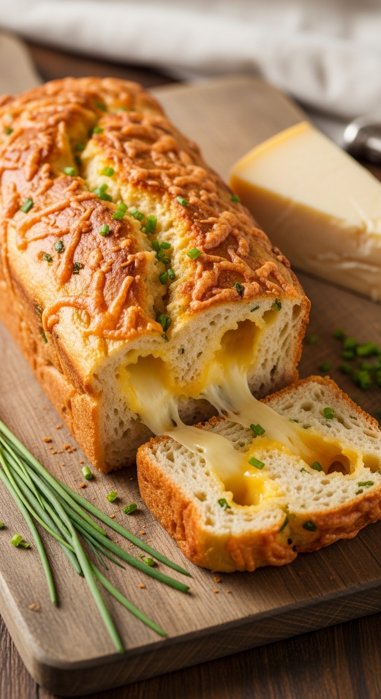 This savory cheddar and chive loaf blends melty cheese with everything seasoning. The cheddar pockets add richness and saltiness. It’s perfect for brunch, grilled cheese, or picnics. You’ll get savory, cheesy aroma and a tender crumb.