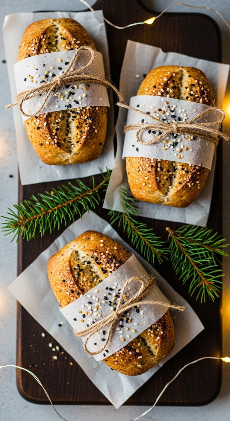 Wrap cooled mini loaves in parchment and string for gifts. Serve with compound butter or flavored cream cheese. Store in airtight bags 2 days or freeze. Make-ahead: bake and gift within 48 hours for best freshness.