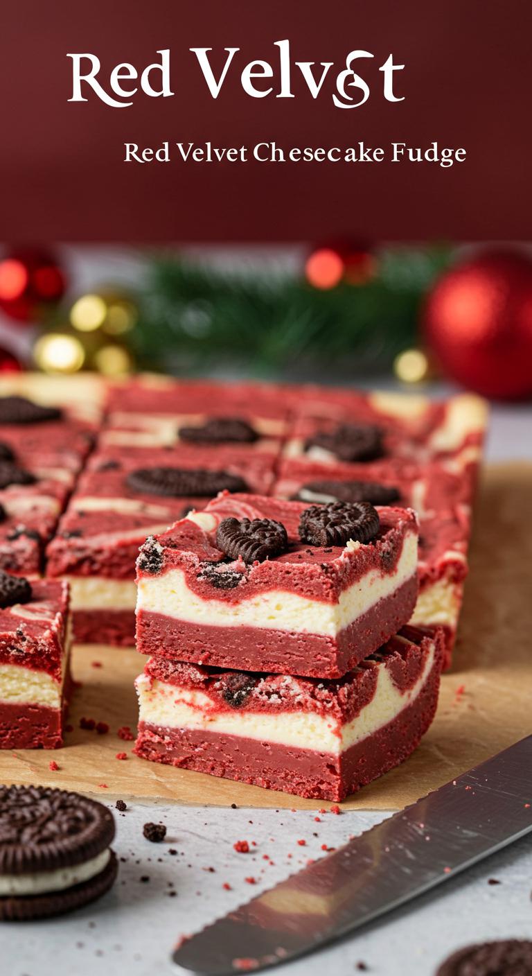 Decadent red velvet cheesecake fudge — creamy, chocolatey, and irresistibly festive.