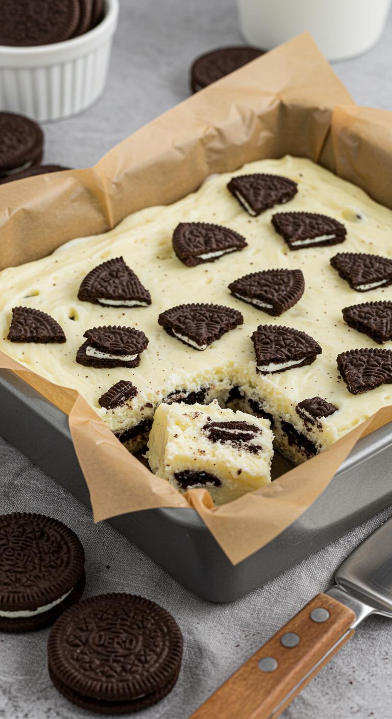 - Sprinkle crushed chocolate sandwich cookies over the top, pressing lightly to adhere (optional).