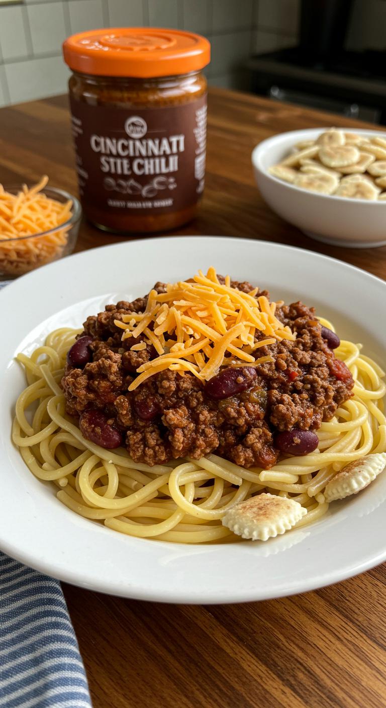 - Spoon a generous ladle of Cincinnati-style chili over each bed of spaghetti.