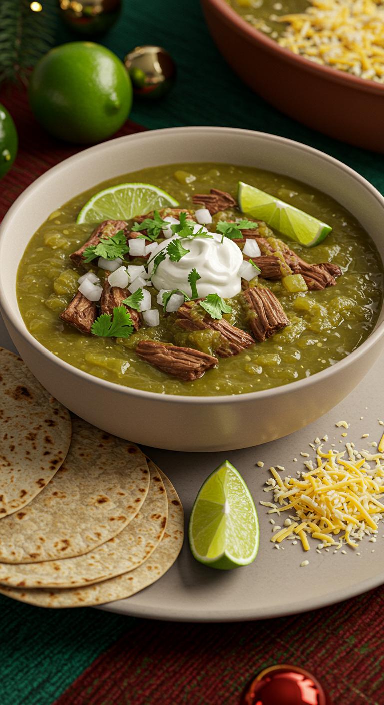 Enjoy a steaming bowl of this zesty chili verde — perfect with warm tortillas or over rice to celebrate the season!