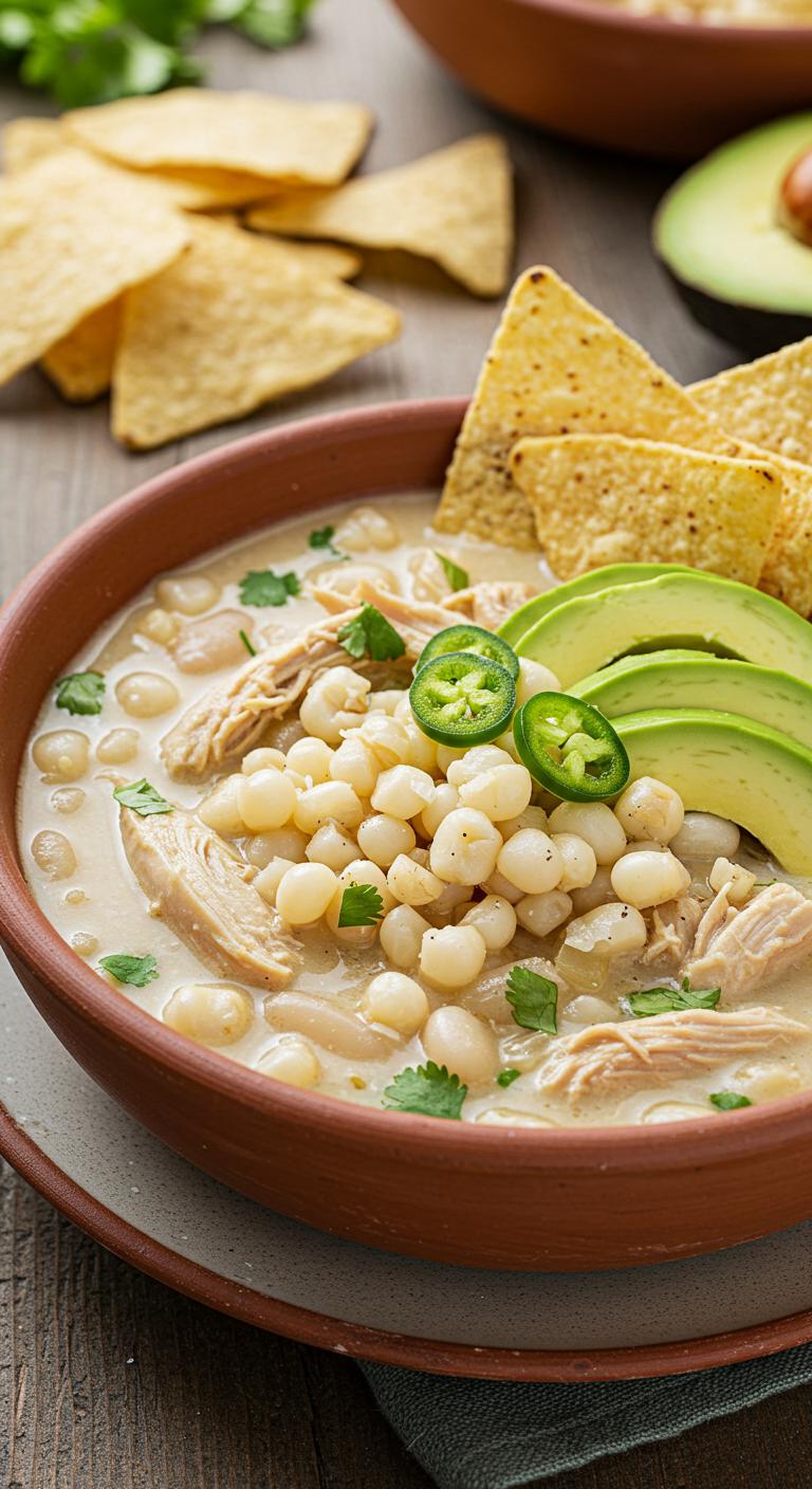 A warm, creamy white chicken chili with tender chicken, hominy, and a hint of green chile — cozy comfort in a bowl.