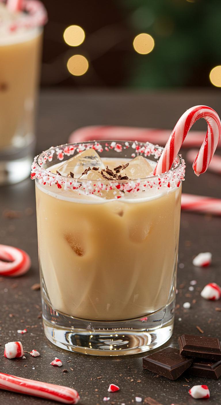 - If you like a festive rim, rub the glass edge with a little cream or simple syrup, then dip into crushed candy cane to coat; set aside.