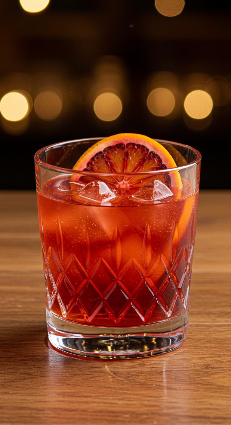 - Garnish with a blood orange wheel or a twist to release the oils.