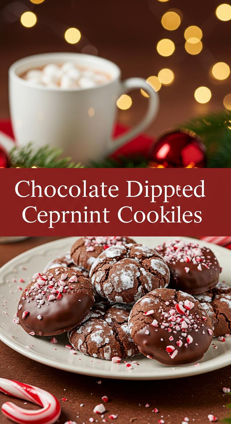 A festive twist on a classic crinkle—chewy chocolate cookies rolled in powdered sugar, dipped in dark chocolate and sprinkled with crushed peppermint for extra crunch and holiday cheer.