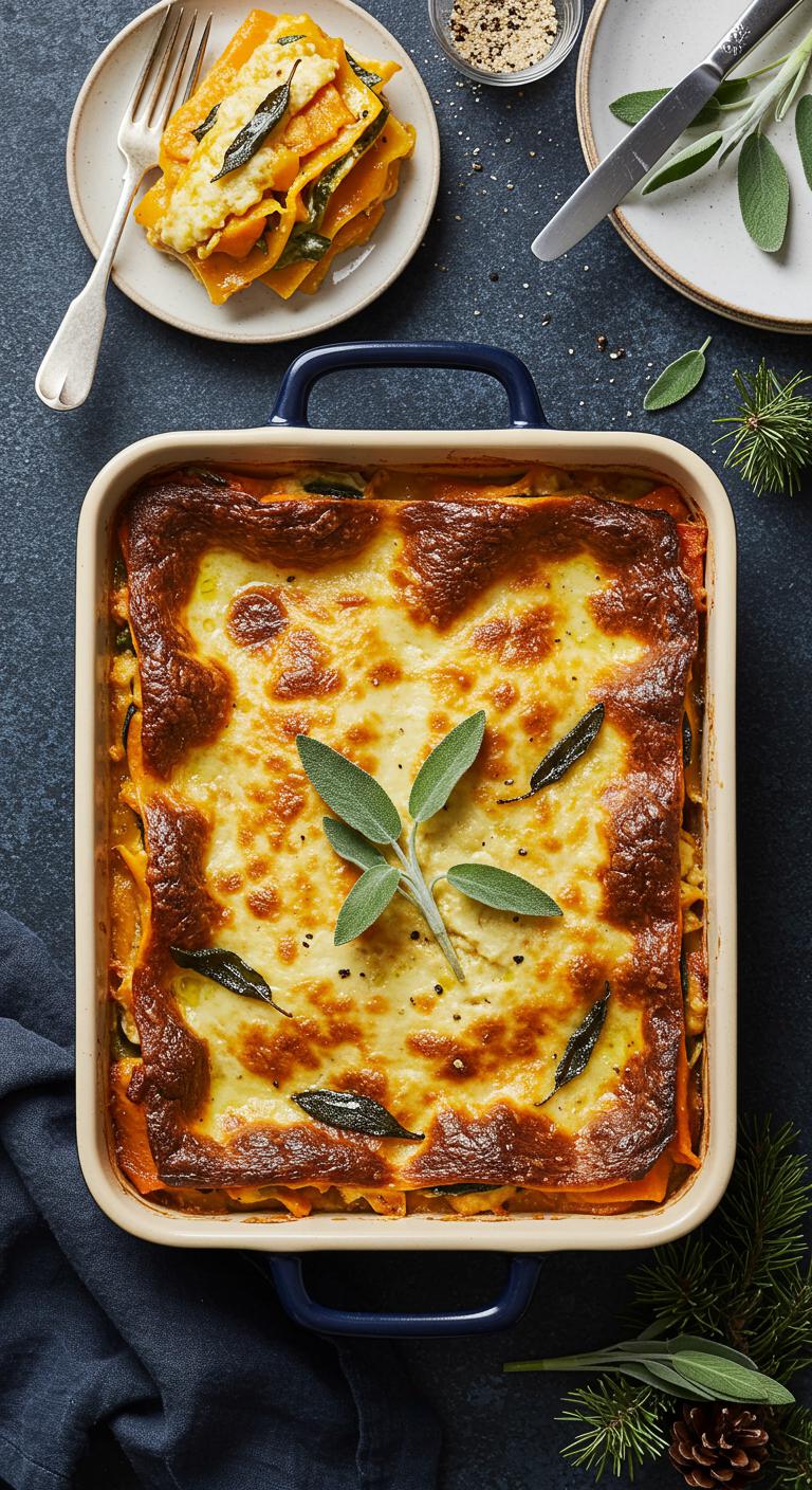 Creamy vegan lasagna layers roasted butternut, sage, and melty dairy-free cheese for a cozy holiday centerpiece.