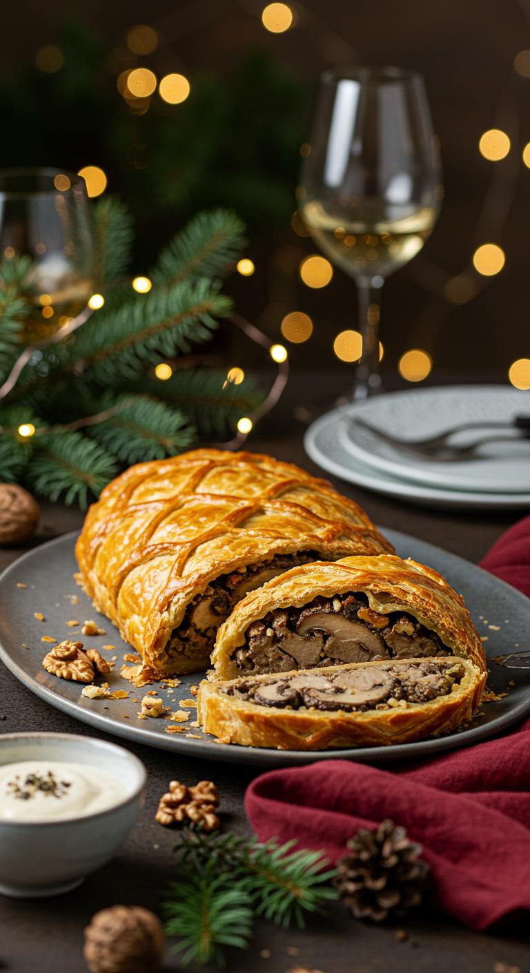 Savory, meaty mushrooms and crunchy walnuts wrapped in flaky pastry — a holiday centerpiece that’s egg-free and irresistible.