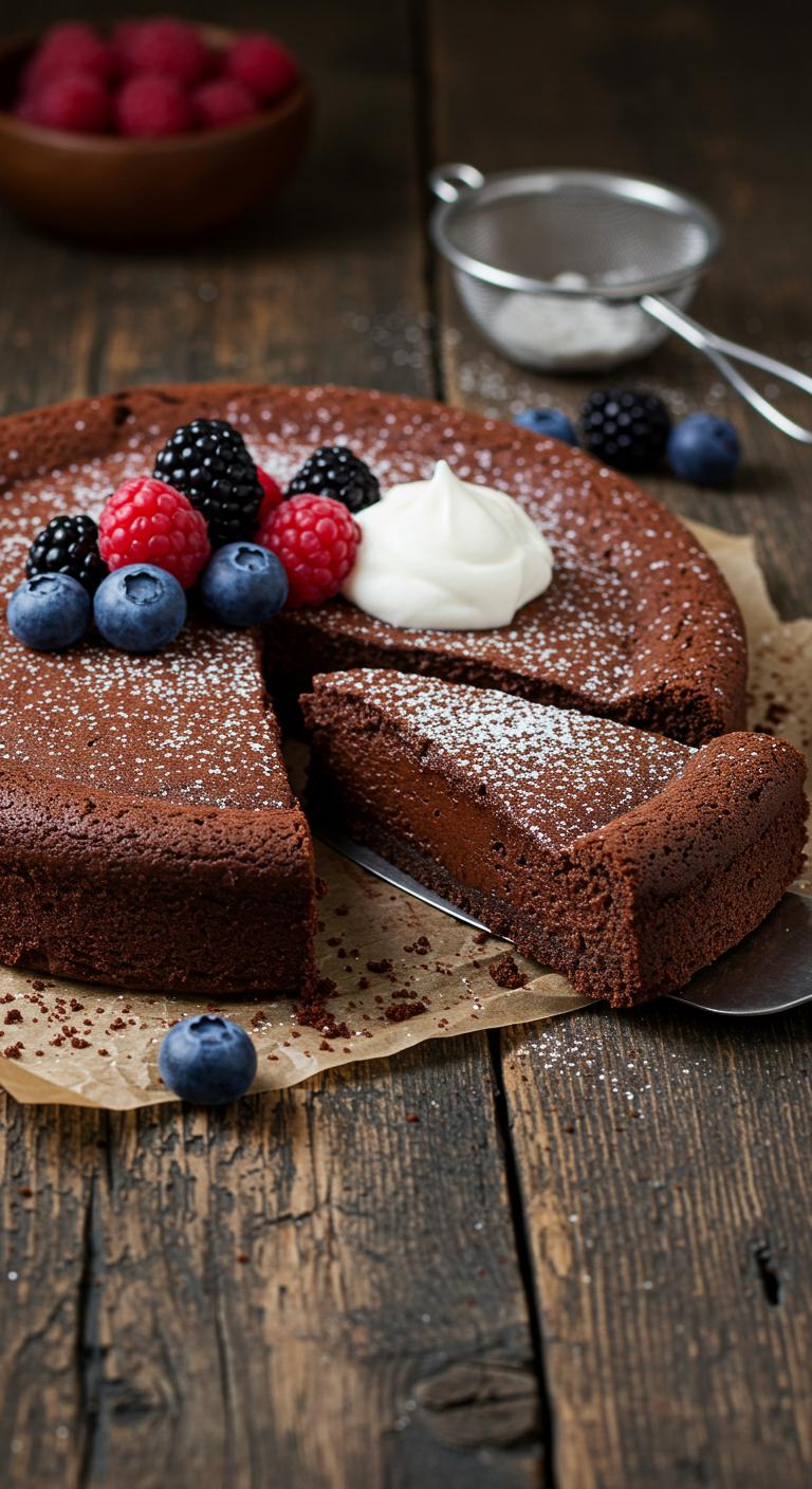 - Dust with cocoa or powdered sugar, slice, and serve with berries or whipped cream if you like.