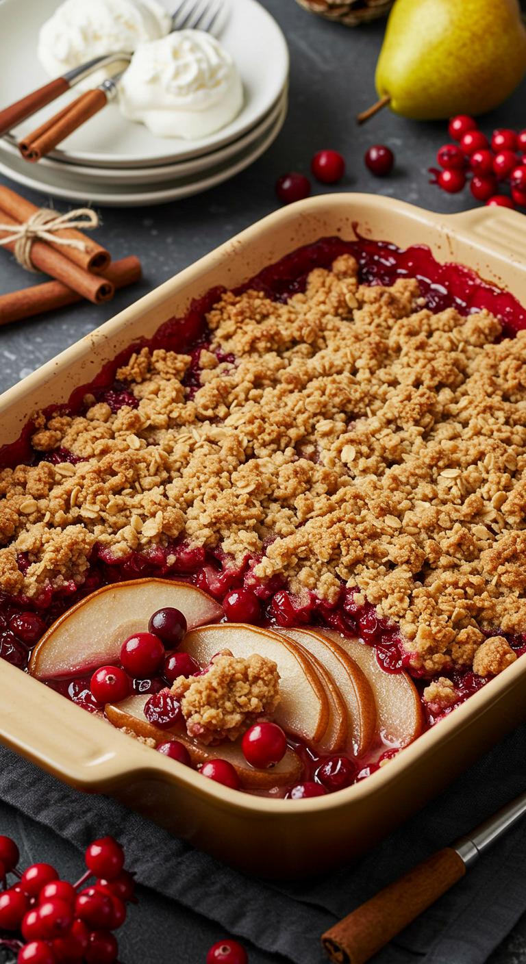 A warm, spiced pear and cranberry crumble that’s cozy, tart, and completely egg-free — perfect for holiday gatherings.