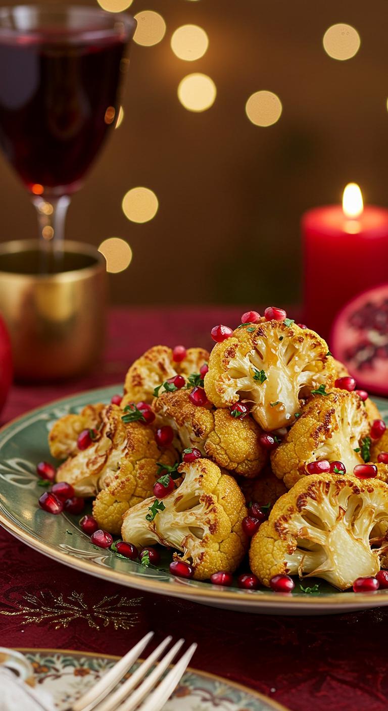 A festive, colorful centerpiece: herb-roasted cauliflower finished with a bright pomegranate glaze.