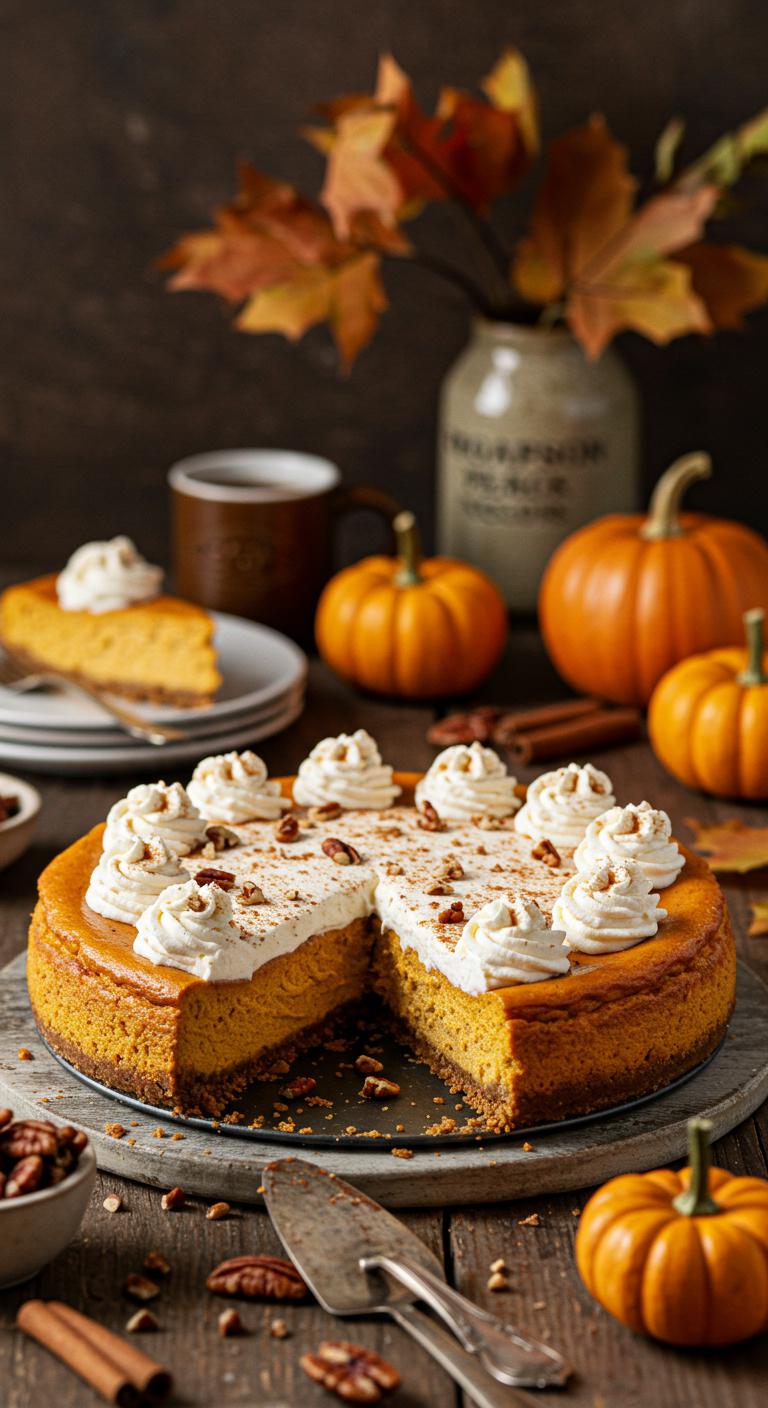 Enjoy a slice of spiced, silky pumpkin cheesecake — perfect for cozy holiday gatherings!