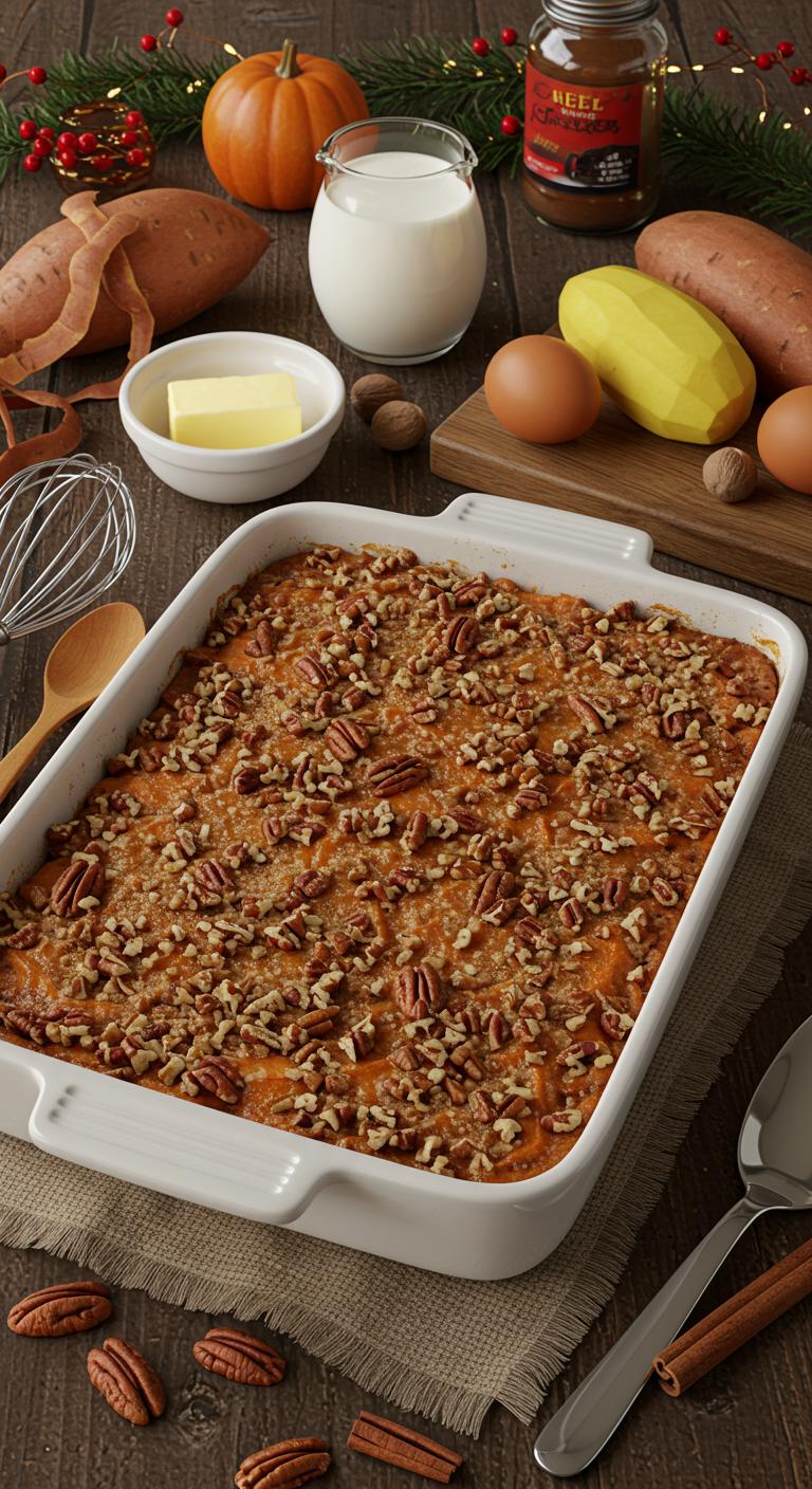 - Evenly sprinkle the pecan topping over the sweet potato layer.