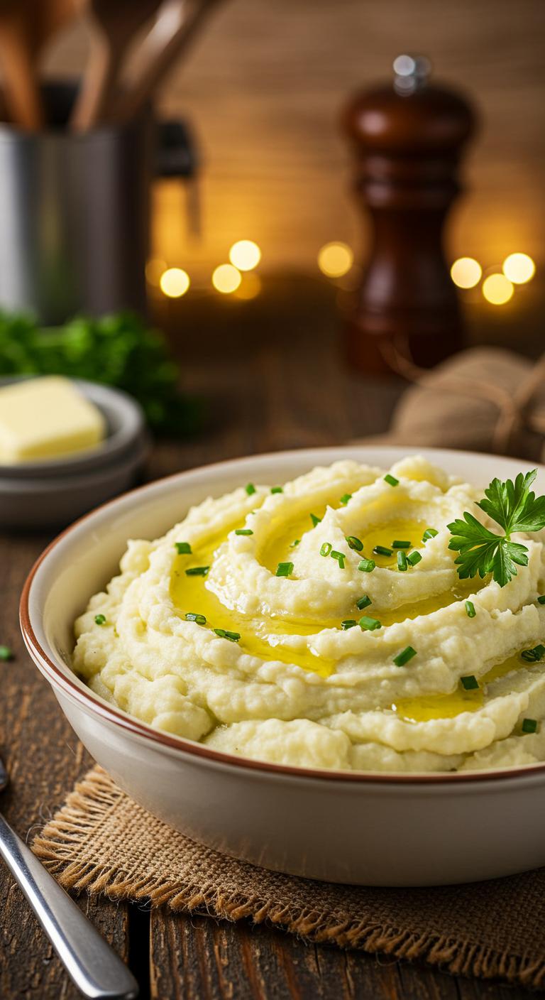 Serve hot and enjoy — these garlicky, herb-kissed mashed potatoes are holiday comfort in every spoonful!