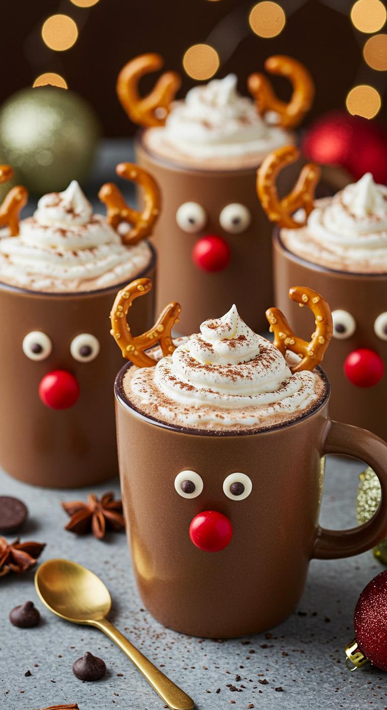 Cocoa Reindeer Cups — warm chocolatey drinks dressed up with a holiday face.
