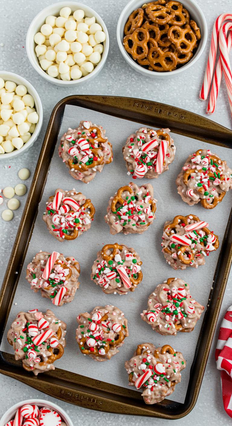 Sweet, salty, and oh-so-festive — these no-bake candy cane pretzel clusters are a snap to make and perfect for little hands.