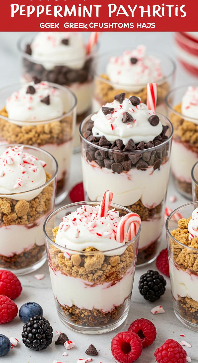 - Top each parfait with a dollop of whipped cream, a few chocolate chips, and a sprinkle of crushed candy cane (and a berry if you like).