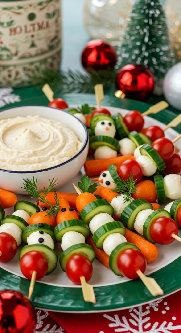 Mini Veggie Snowmen Skewers — cute, crunchy, and perfect for little hands at holiday parties!
