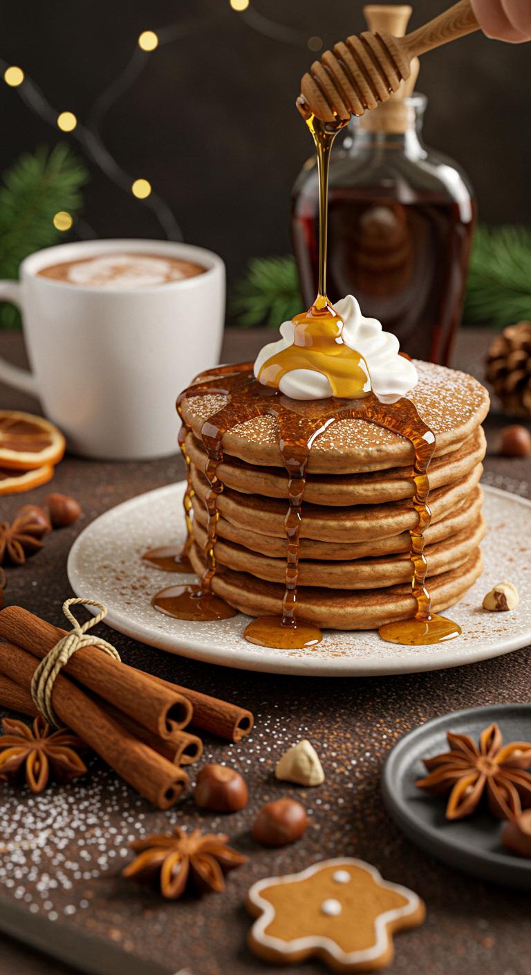 Warm, spiced pancakes piled high with gingerbread flavor — perfect for cozy holiday breakfasts.