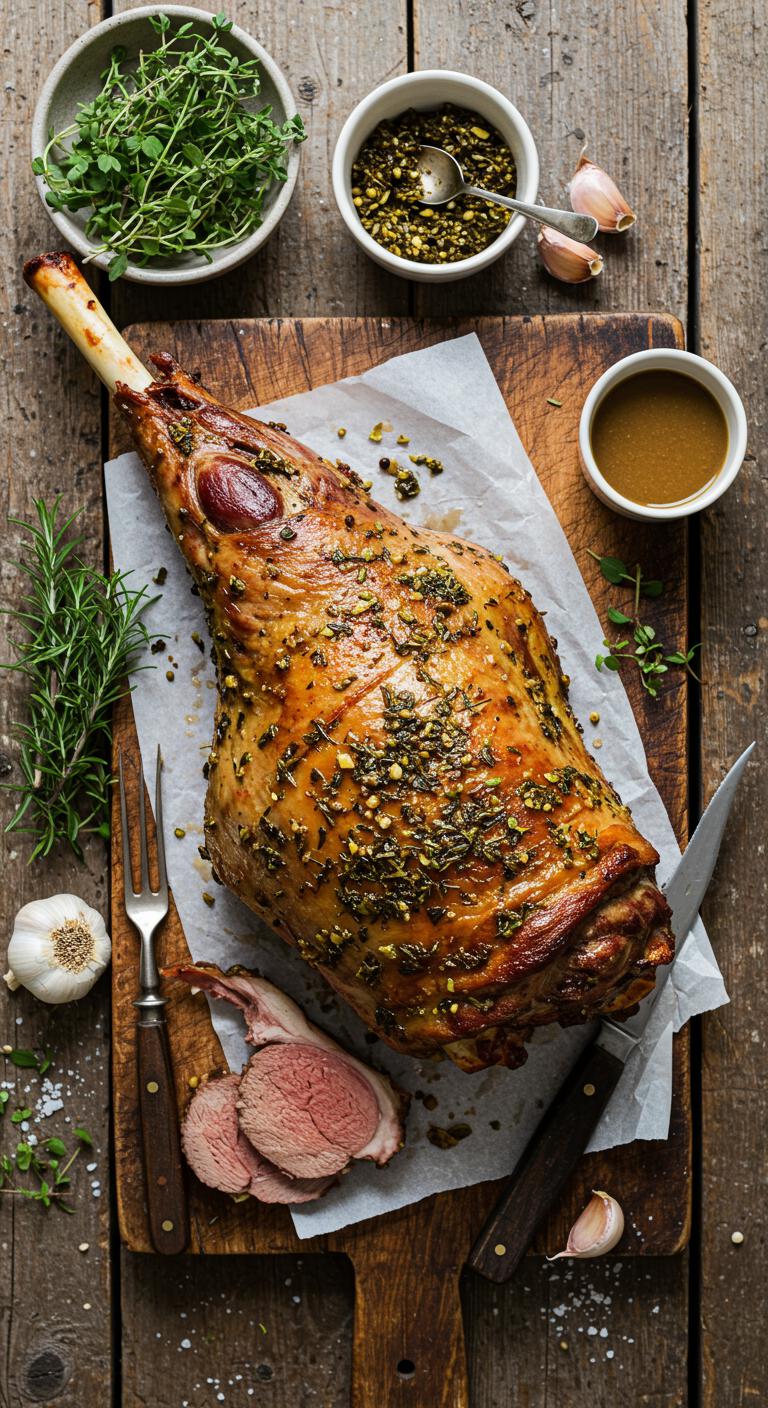 Herb-Crusted Roast Leg of Lamb — a golden, fragrant centerpiece that’s easy to make and impressive to serve.