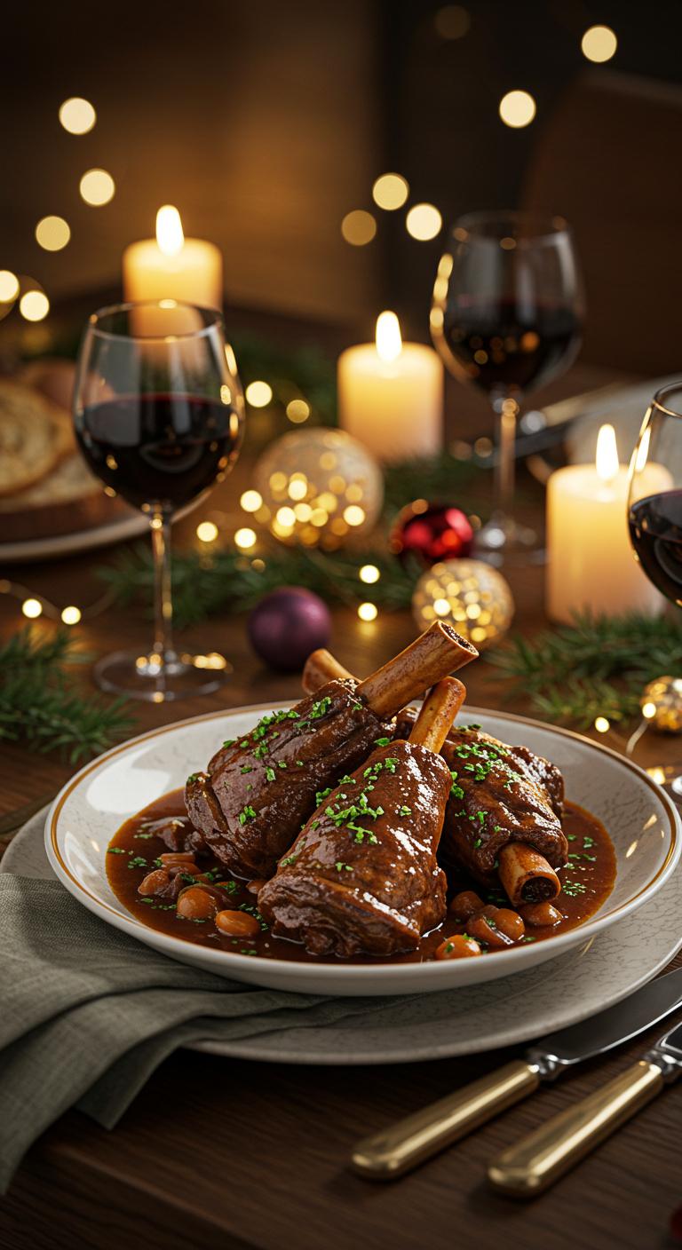 Slow-braised lamb shanks in rich red wine — melt-in-your-mouth comfort perfect for holiday evenings.