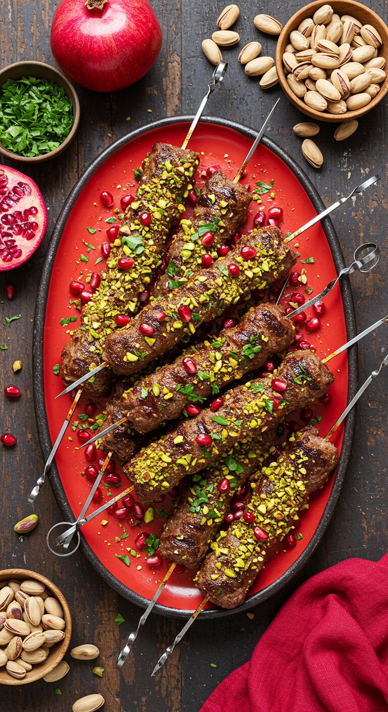 A festive, crunchy-sweet lamb kebab brightened with pomegranate and toasted pistachios.